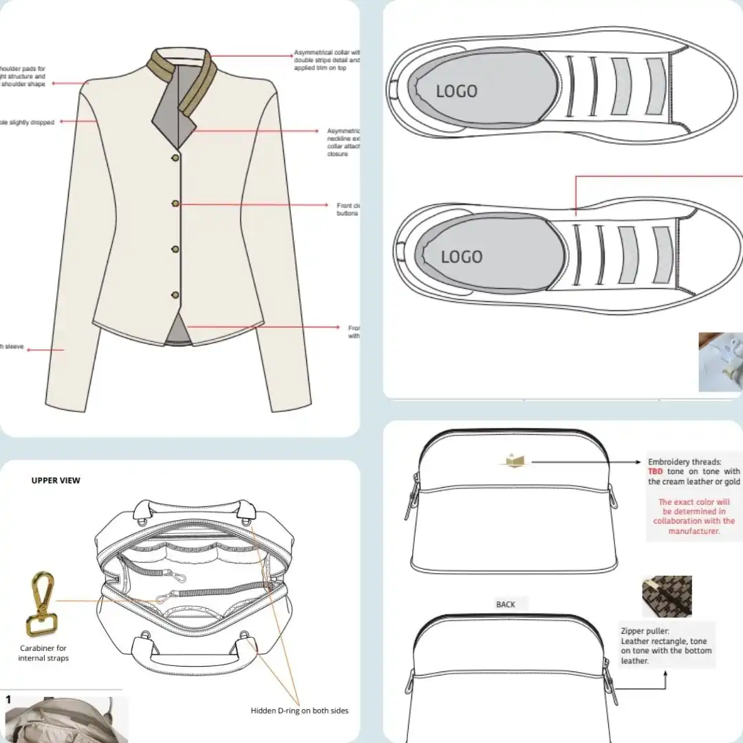 We develop technical designs across multiple fashion categories, including ready-to-wear, bags, footwear, outerwear, knitwear, and small leather goods, covering both simple and complex products.